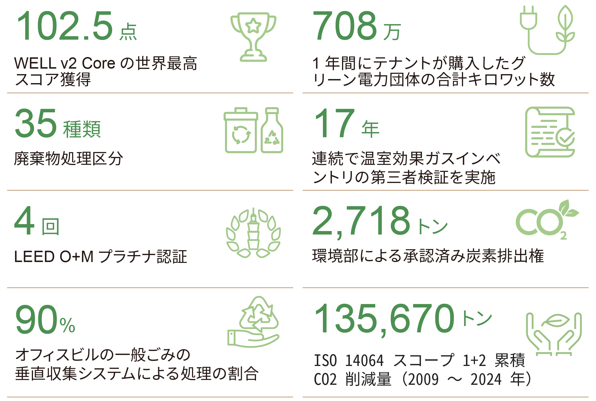 グリーン経営の高度化持続可能な環境の実現に向け た取り組み エネルギー資源管理の強化、 循環型経済の推進、テナントのグリーン電力購入の奨励を行うとともに、建築のサステナビリティ認証を獲得し、経営による環境への影響を軽減することで、超高層ビルのグリーンモデルとなります。 |