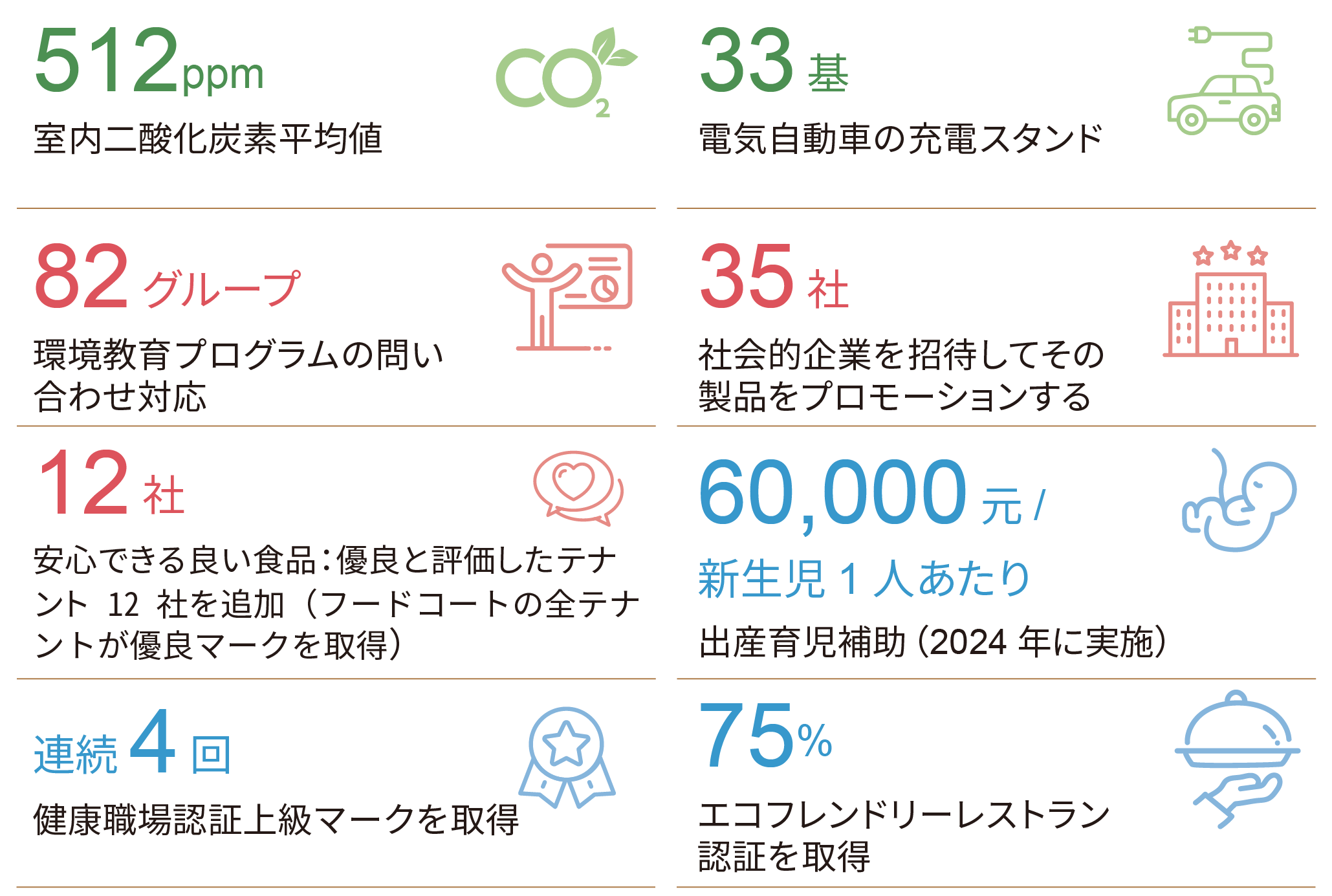 台北101は、そのサステナビリティを主軸として、「貸し手とテナントの一体化」という戦略を採用し、モールのブランド、企業テナント、戦略的パートナーに「持続可能な環境の実現に向けた取り組み」「多様で持続可能な協力関係の構築」という2つの側面に注力するよう呼びかけています。また、持続可能な経営・グリーン経営・社会的影響の高度化などの戦略的行動を活用し、自然環境と人間社会における持続可能な実践に取り組み、より大きな社会的影響と可能性を生み出しています。